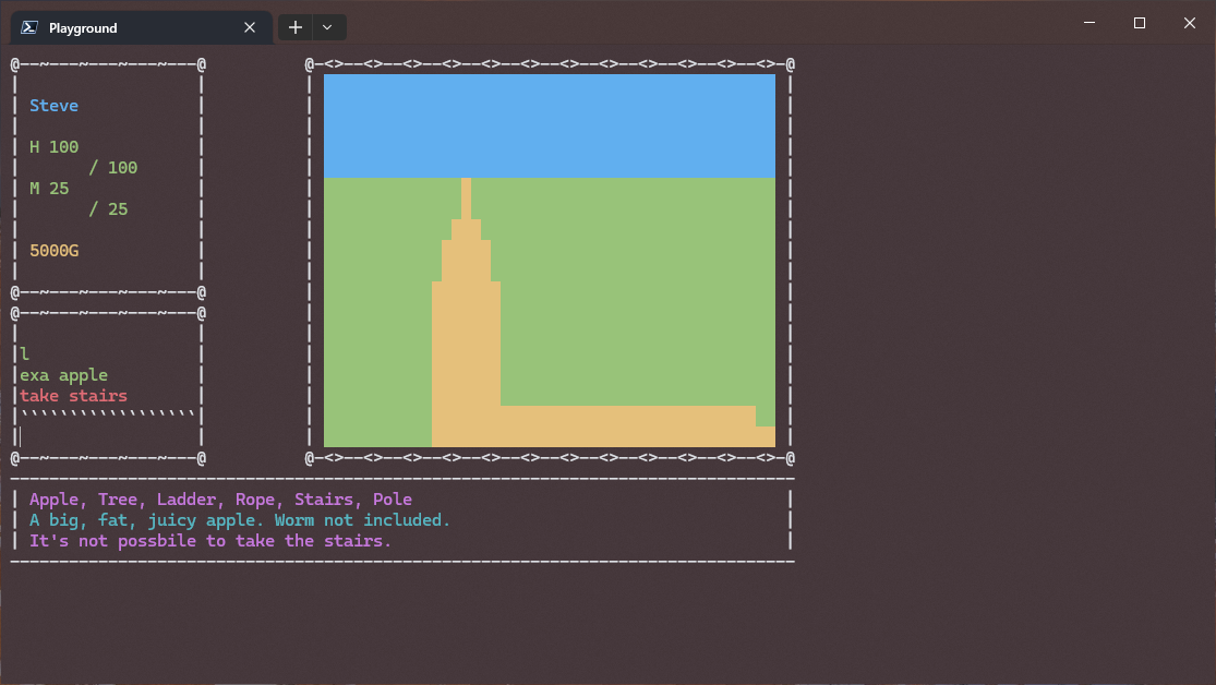 The thing to keep in mind when looking at this is that all data was positioned absolutely in the terminal buffer. The "borders" around the "windows" were really nothing other than buffer cell noise; Rube Goldberg Machines in text form. Also, as I've said before, everything you're seeing here is literally all strings. Even the "image" that's shown in the window on the right side (it's supposed to be a road going north and east but looks like a potato L).