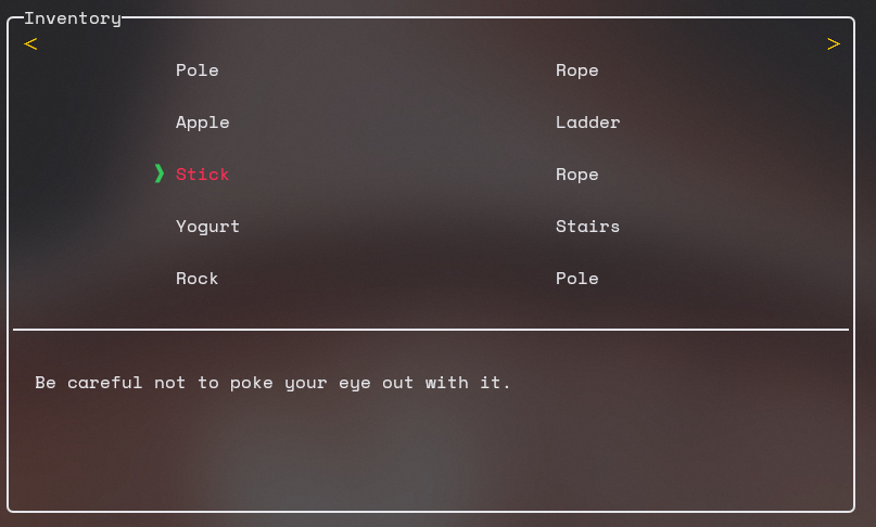 As if that weren't enough, none of this covers the interaction model for the chevron and the implications that it has for the drawing of elements in the window. The player is able to obviously move the chevron up and down in a given column using the up and down arrow keys respectively. They're also able to move the chevron left or right between columns in the same row using the left and right arrow keys. If a book has more than one page, special paging chevrons are displayed in either the top-left or top-right corners of the window to indicate that you can cycle pages in a specific direction. The visual presentation of these paging chevrons is also governed by the current page of the book and the number of pages surrounding it. For example, if there are at least two pages in a book and the player is on the first page, the right-paging chevron is shown. If the player cycles pages to the next page on the right, there are no further pages to move to on the right so the player can only page left. So when they move to the last page in the book, only the left-paging chevron is visible. In other cases, when the player can page either left or right, both of the paging chevrons are visible. The player can press either the A or S keys to page left or right. Cycling pages has implications for both where the slice frame is viewing the player's inventory as well as the current position of the player's chevron. In other words, consider what would happen if on the current page the player's chevron was located in the right column on a specific item. If the player cycles the page, consequently changing the slice, what happens if the chevron is now located in column that doesn't exist because on the new page there are five or less items in the slice? Finally, because of how items are used in the command parser dialect (first available instance), the player would need some method to remove a specific instance of an item from their inventory lest they unintentionally use an item that has a deleterious effect on the player; there's no way to specify which of an item to use if more than one is owned.